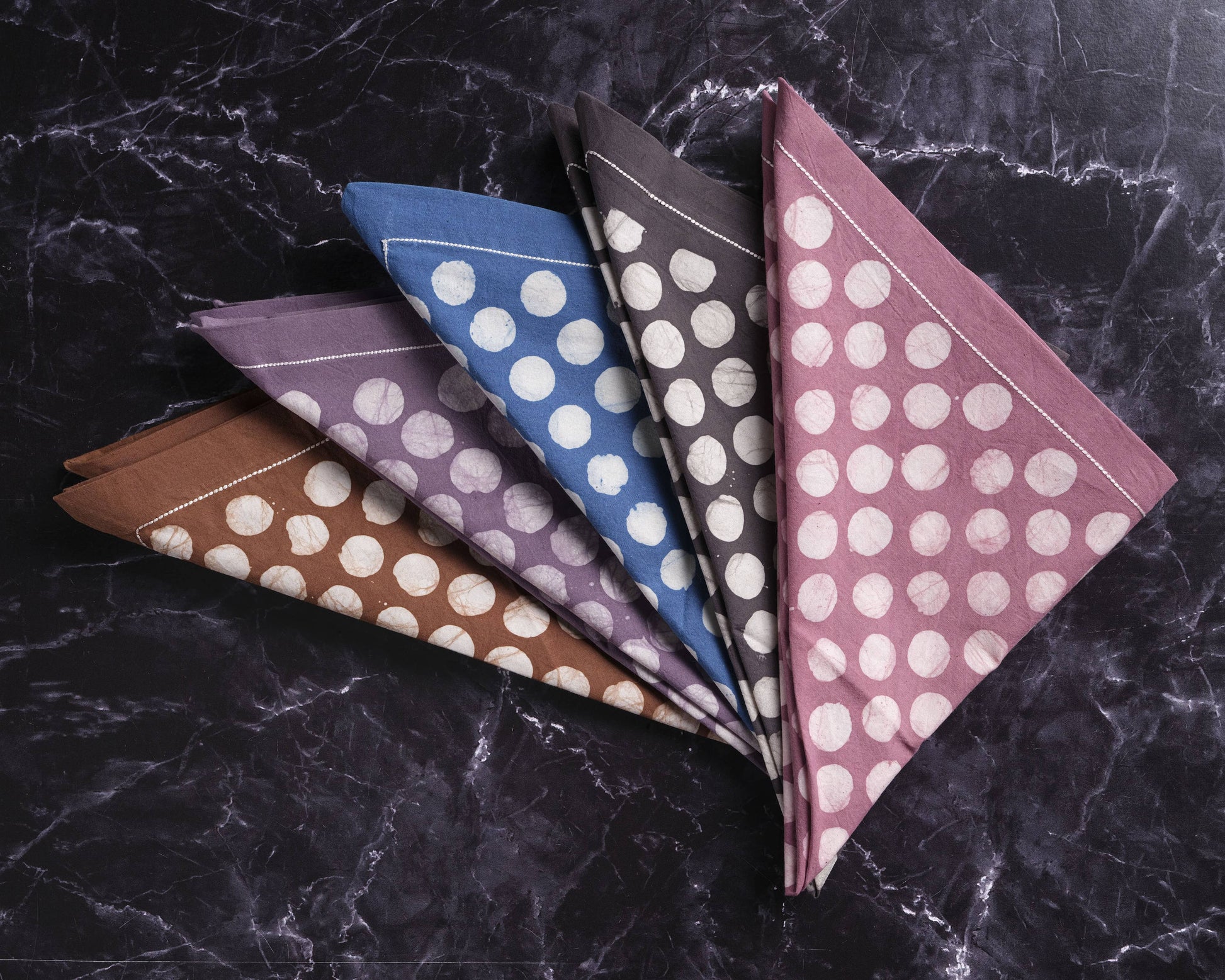 20" x 20" These dinner napkins are naturally dyed using botanicals by a collective of women artisans in India who are differently abled. This work empowers them with skills and financial independence. Made from 100% cotton and naturally dyed using the traditional Batik technique. Due to the hand-dyed process, dye patterns and shades will vary with each piece Ideal for both everyday use and formal gatherings Easy care: hand wash or cold wash with mild detergent; lay flat to dry.