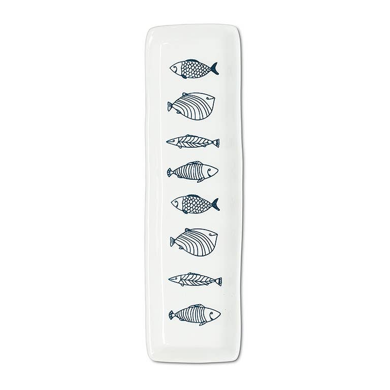 Enjoy more than just seafood with this long, slim rectangular fish plate. Made of white stoneware with minimalist, Greek-inspired line-drawings of fish in blue. Perfect for Sushi!