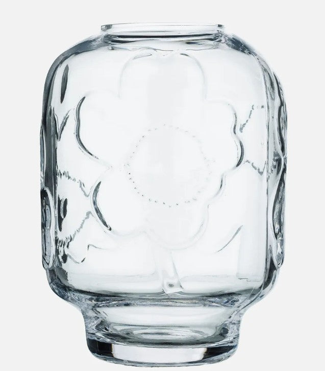 his glass vase features the embossed Unikko pattern. We recommend washing the vase by hand. This product is made of clear mouth-blown glass. Marimekko’s glassware items are mouth blown into a mold. Being made by hand, they may contain small signs of craftsmanship. Slight variation between products is natural.